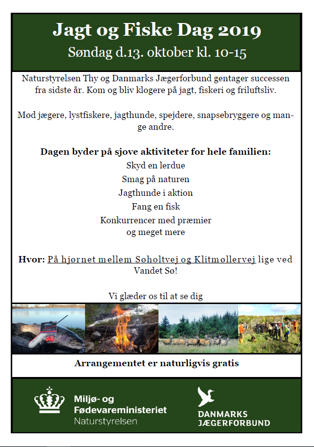 Naturstyrelsen Thy og Danmarks Jægerforbund inviterer til Jagt- og Fiskedag 2019 søndag den 13. oktober kl. 10-15 ved Vandet Sø i Vilsbøl Plantage. På dagen kan du være med til at opleve, hvordan naturen kan være et stort spisekammer. Der vil blive tilberedt vildtkød over bål, og der er mulighed for masser af smagsprøver. På dagen vil der også være svampesamlere og snapsebryggere, der gerne vil give deres viden om naturens skjulte skatte fra sig.