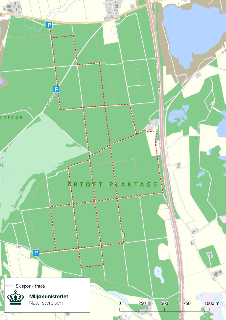 - Torp og Årtoft Plantage ca. 12,5 km. Parkering ved Tinglevvej mod nord, Golfbanevej centralt og Plantagevej mod syd.